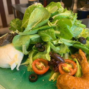Fresh buratta cheese, deep fried shrimps, mixed Greens, honey mustard vinaigrette